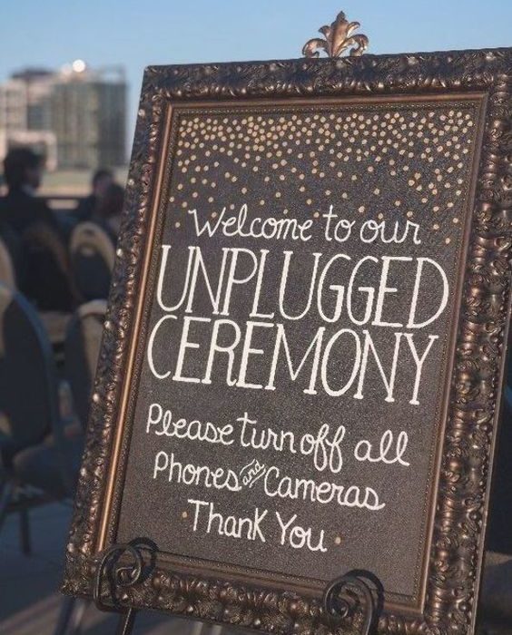 If you’re putting up any decorative signs around your venue, you may want to use one at the entrance to the ceremony space. Invite guests into the ceremony with a sign that says “Welcome to Our Unplugged Ceremony.” If you’d like, you can further explain that you’d like guests to be cell phone-free during the night. Feel free to have a bit of fun with the language so that it reflects your personalities (“we want to see your faces, not your devices” is a popular slogan).