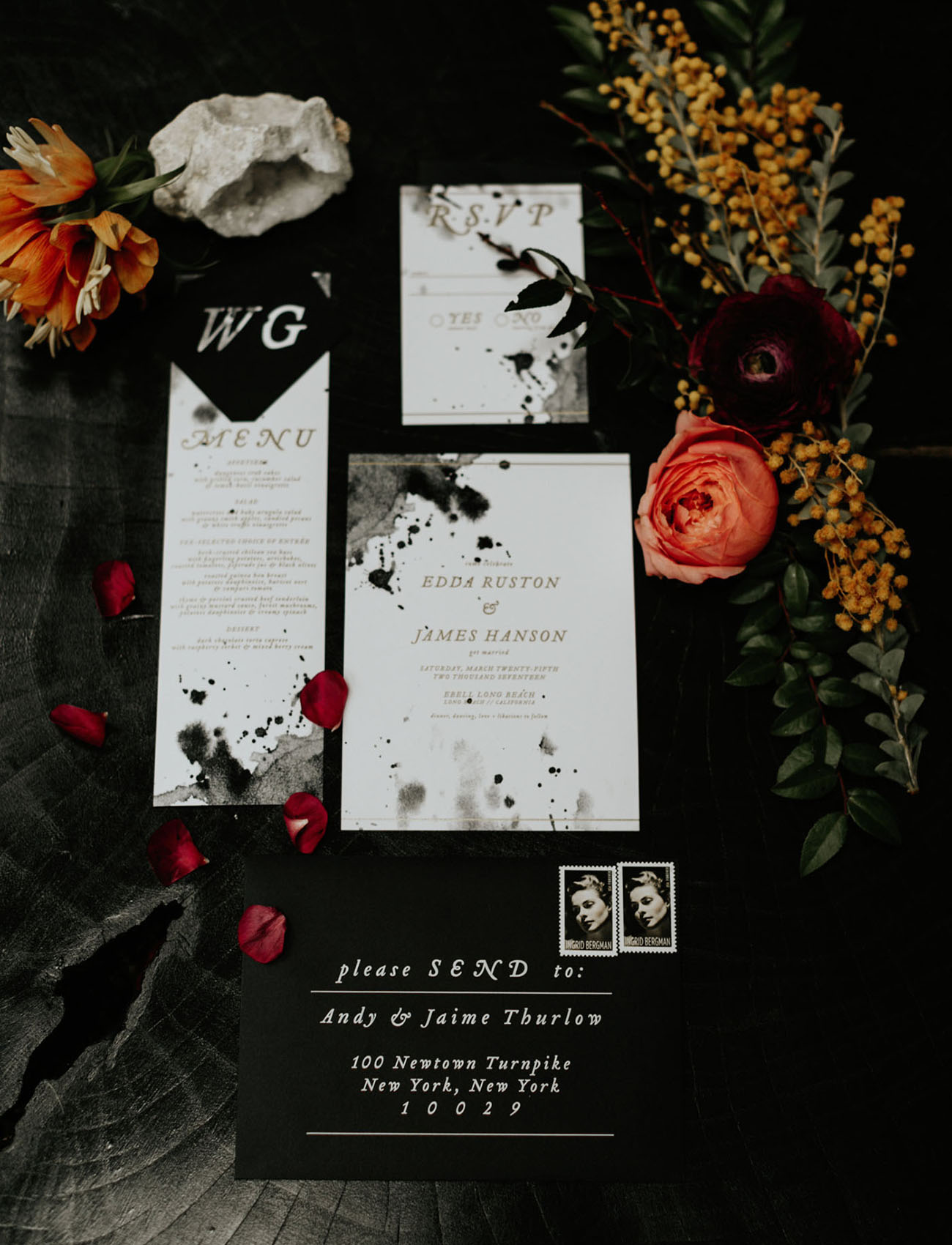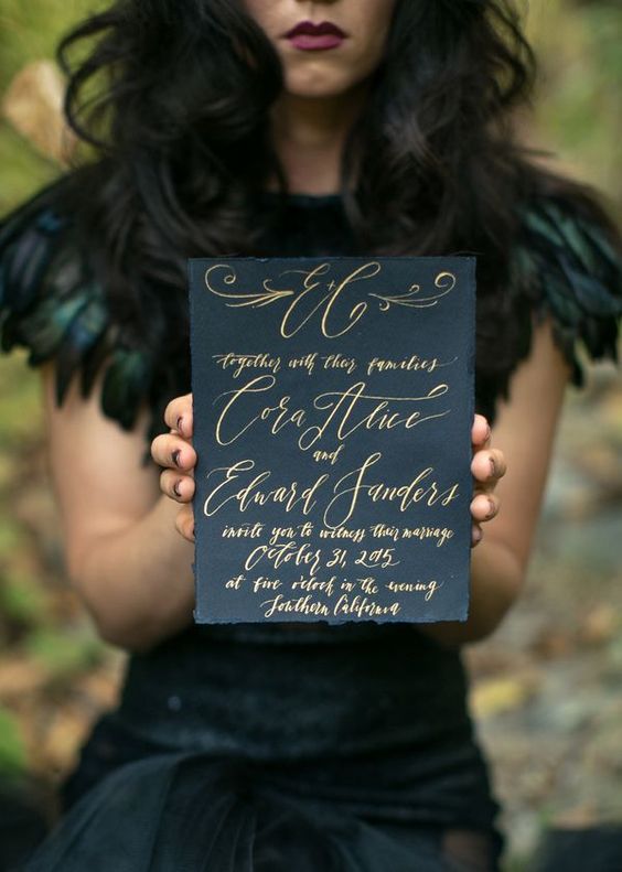 The ideas here are endless. You could incorporate skeletons and other spooky “halloween” elements. Have your invitation wording read like a witches spell. But a few simple classics like dark moody colors, calligraphy, and I’m especially loving the ink stained look for something a little off beat.