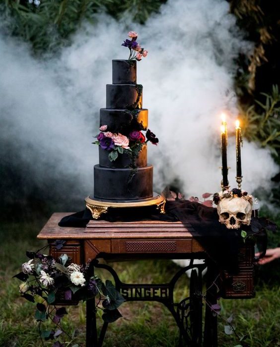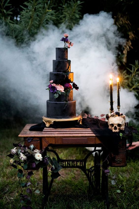 Depending on what mood you’re trying to create, the cake and the food could be beautifully gothic or just full on Halloween influence. We can start by incorporating black into the cake and other desserts (if that matches your palette), or go full spooky. Either one will create a fun Halloween atmosphere for your big day.