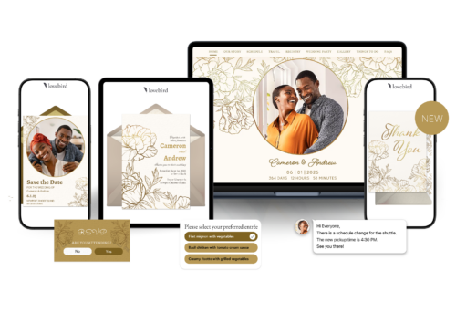 Introducing Lovebird — the most elegant way for engaged couples to communicate with their wedding guests. Lovebird offers brides & grooms an elegant and sophisticated way to share all the important details about their wedding, seamlessly collect the information they need, and make an exquisite first impression. Create premium wedding websites, send gorgeous digital save the dates and invitations, track RSVPs, collect meal selections, communicate last-minute information, send thoughtful digital thank you cards, and manage every touchpoint with guests in one place.