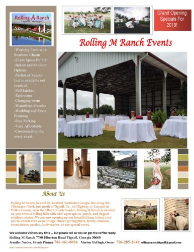Full of family southern hospitality, Rolling M Ranch, located in beautiful Northeast Georgia, lies along the Chickasaw Creek, just North of Tignall, GA on Highway 17. Located in Wilkes County, near the Elbert County Border, Rolling M Ranch is situated on 500 acres of rolling hills with wide open spaces. There are barns, ponds, a gazebo, and lots of southern charming indoor and outdoors spaces to host your special day. It is a working farm with Southern Charm, event space for 300, full kitchen, restrooms, bridal suite, wedding and event planning, free parking, and customization for every special day. We welcome visitors anytime, but please call so we can get the coffee ready.